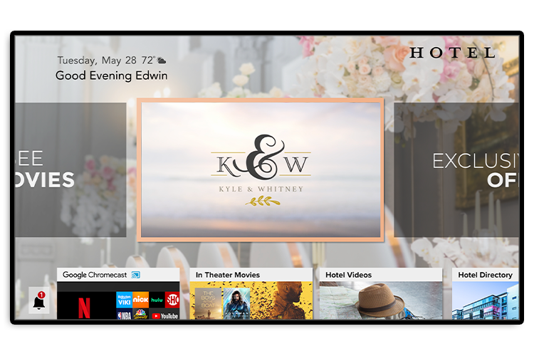 As part of your event offerings, you could promote an add-on custom TV package. With it, the TVs in their room block could power on to a menu in the wedding colors with a background image of the happy couple.