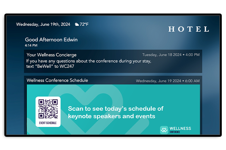 At turn-on, the TV features a personal greeting along with the conference’s logo and brand colors, making it a great way to welcome attendees in the rooms associated with the event.
