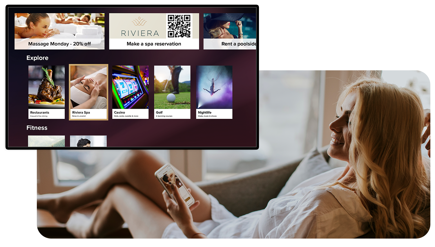 And for even more in-room entertainment, you can offer on-demand content like still-in-theaters movies, in-room fitness and wellness videos, and libraries of favorite films.